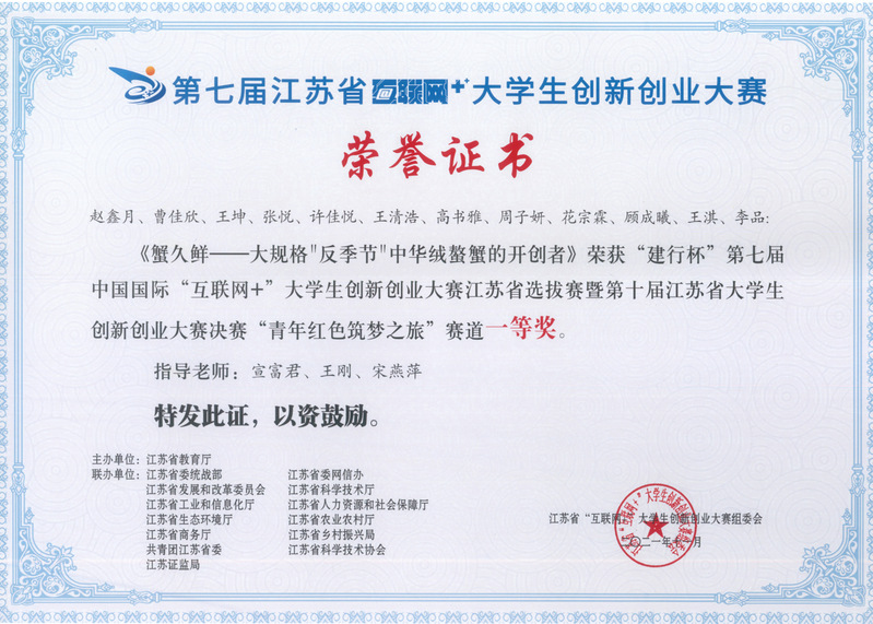 宣富君老师指导的“蟹久鲜-大规格“反季节”中华绒螯蟹的开创者”荣获第七届中国国际“互联网+”大学生创新创业大赛铜奖;汪正飞老师指导的“基于转录组学的武装圆轴蟹陆生适应机制研究”荣获全国大学生生命科学竞赛(CULSC)-创新创业类全国一等奖。